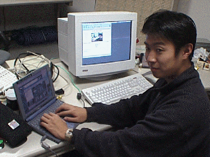 ソニーCSLのadmin部屋の私の席にて我が愛機たちとともに (デスクトップ=kiichi:Dell OptiPlex-GXPro266, ノート=ilmoro:VAIO505-GX, 1998年11月現在)